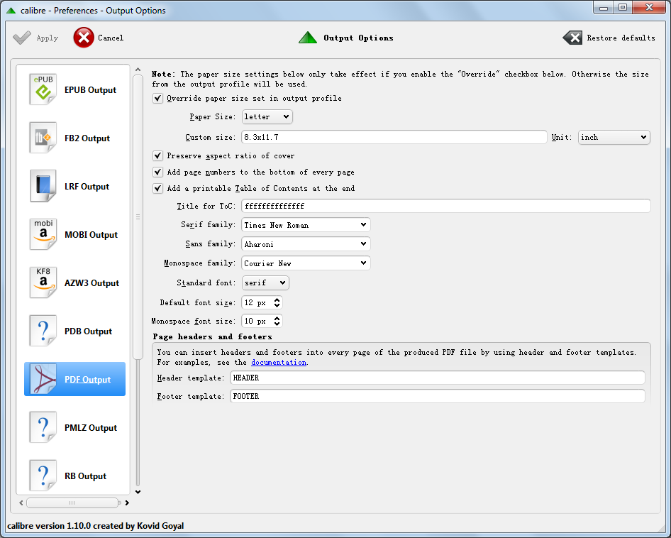 I've tried converting HTML to PDF. It looks great except for the large text size. I've modified the Output Options / PDF Output options as web searching suggests. I've set the format to override to various page sizes.. to no effect. I've checked the option for page numbers. To no effect. I even started Calibre in debug mode, and the list of attribute values do not reflect my changes to the preferences. They're the defaults. pdf_page_numbers for example should not be False.
