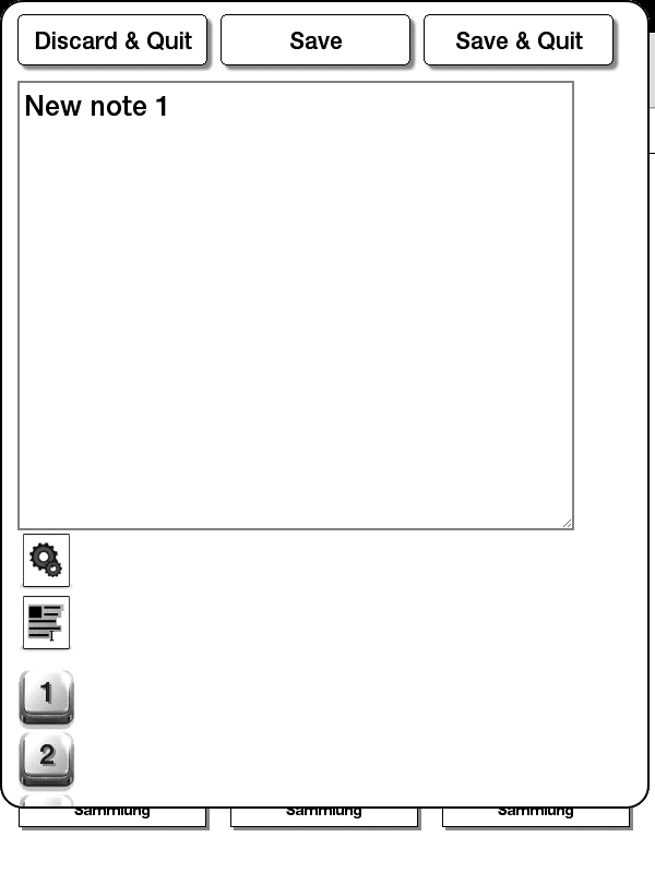 Version v. 0.3 - Fixed "missing buttons on the right" bug - Critical update: Fixed moving-note instead of copying-notes during exports - Better notes icons - Minor improvements Version v. 0.2 - Better overall performances - Notes are now in an editable format in notes folder - Saving state is now notified in a more accurate way As its predecessors, I've written it from scratch for you, Kindle users only! ![]() It's really tiny (73.3 kbyte uncompressed), and as usual based on HTML+JAVASCRIPT+BASH languages. KindleNotes supported gestures: - Swipe-right: bigger fonts - Swipe-left: smaller fonts - Double tap: default fonts You can write up to 5 different notes, and export them also into documents folder or leafad app (if it is installed!). Native predictive text is supported. For best result and loading times, I suggest you to install this app from the whole Kindle Menu bundle pack, v. 0.8 and above. In fact, this app is mainly thought as support tool for Kindle Menu users. TODO: - Add support for text selection - Add copy/past tools (requires text selection before) - Add an alterative, faster keyboard (matchbox-keyboard) - Add a way to import text from other files I'd like to see how does this app show on Kindle Touch device (I've tested it only on my PW), so any screenshot is welcome! Enjoy! Note for developers: I know that the code is quite "rustic" to understand now, I'll make some order before next updates. Last edited by Aeris; 11-13-2013 at 04:29 PM. |