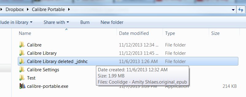 I don't know what the circumstances around it's creation were, but if this is a part of sending books to the recycle bin then maybe Dropbox prevented the deletion of this folder after it was created due to a temporary conflict. Last edited by DoctorOhh; 11-13-2013 at 01:45 AM. Reason: Wrong calibre version listed |