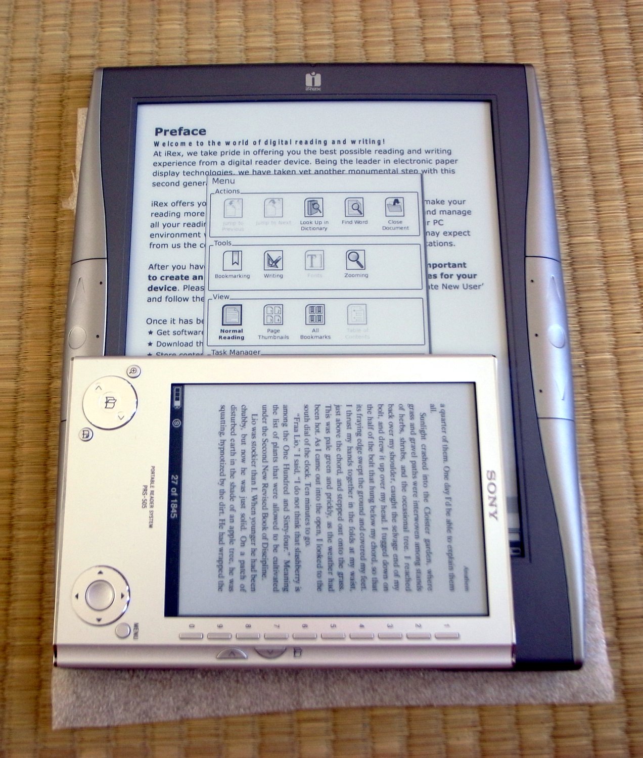 I ordered the DR1000S and Deluxe cover from eReader Outfitters and the accessories from iRex directly. Through some coincidence, they arrived together (good thing, since the Deluxe cover is not available... yet) If the DR1000S is big, the (cardboard) box is gianormous ^_^; It came with a "Reader 101" sticker covering the screen, and still had enough charge left for me to play around with. It's certainly the snappiest e-ink reader I have used, esp. with PDFs (not that I have any love for that format, on the Sony the newly-introduced oddball reflowing just isn't much good...) It has so far opened every file I have thrown at it, the first time you opened it it may take a while, but after that it's much faster. As an avid comic/manga fan, it is nice to just throw a folder of uncompressed images on there (no compressed folders yet) and read away, fast and almost always without scaling since most images are in the 1100-1200px height range. Add to that the fact that this screen uses 16 grayscales on top of the high resolution and a PROPER FULL SCREEN MODE and the result is simply outstanding, even for photographs. The Screen is slightly lighter than my Sony, maybe it's the actual e-ink tech or maybe it's because my Sony is older... in practice it doesn't make much of difference though. The weight is perfectly OK, but in bed I'll continue reading on my Sony because of the small size and the added light. The cover is nice and solid, even though the fake leather is easily scratched. Inside there is space for the pen on top (the elastic bands are two sizes, presumable to fit either pen), space for some creditcard (or the much needed reset-paperclip in my case -_-) and some paper behind it. For some strange reason the iRex logo is on the BACK (?) so I tend to open it the wrong way... The pen (interface): I still have to get used to the fact it's there at all ^_^ I have locked the right-hand side of the sensor keys since I keep hitting them with my palm while I use the pen. I have included an image of the included pen, the "professional" pen and the current-gen Wacom pen (which doesn't work - not the same tech) The Pro pen is very comfortable and has at least one button (which isn't used yet, like the eraser on the back) Sketching is pretty much out (I had some hopes for that) It's too slow, but I'm not entirely sure it is strictly due to the screen tech. Weirdly enough, it's all vector based (like Flash or Illustrator), and not a plain bitmap sketching app (like Photoshop or Gimp) It is clearly visible when you use the eraser: it erases entire lines at once, rather than the area you rub on. This also explains the absence of pressure sensitivity and grayscales (it seems the reader has enough trouble keeping up with drawing a fixed-width black line) I hope they will either change it, or there will be a sketching app at some point. I think the hardware is capable enough. The interface in general works pretty well for me. I too get thrown off because the bottom sensor pad central button is ALWAYS the menu button and not an "Enter" key like the other ones. That is true in landscape format too, whichever "side" becomes the bottom, also becomes the Menu button. The PC software is useless, as in -not working at all as described-, but also as in -superfluous-. I still have to figure out what good the "My iRex" account is, maybe once the functionality is fixed in the software. Last but not least, some screenshot of the SDHC card issues (they mostly work, but you can't format them on the device) The "setup card" works as well, but as others have pointed out, that does not include the large files on the original card (PC software, Manuals) Download these directly from iRex if you accidentally deleted them. Charging: Despite the huge price tag, no charger... bleh. I have successfully used my Garmin USB charger (for their GPS devices) It's very compact and comes out of the box with most international plug adapters, which is really nice. I think that's enough for now. Ask away. |