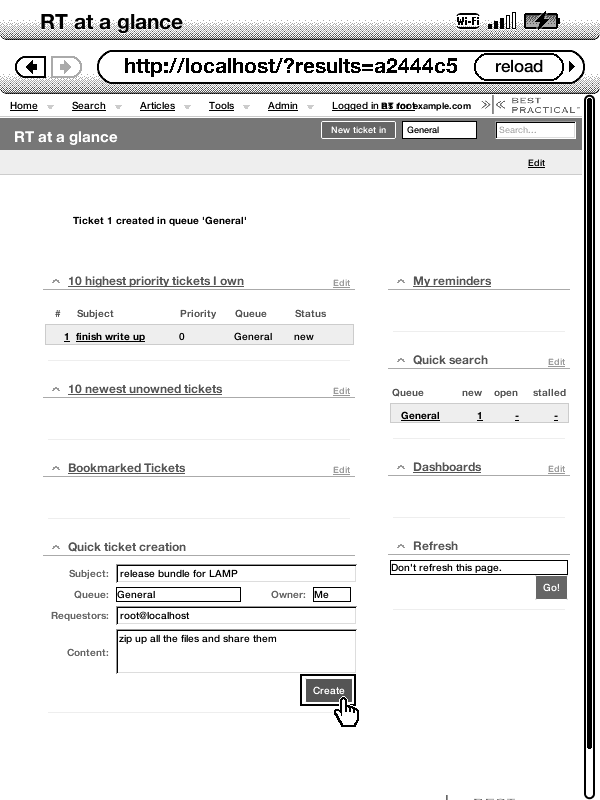 and then a couple of extra commands pointed at our postgresql database server [Add details about that.] Okay let's test out our RT fast-cgi module [root@kindle root]# LD_LIBRARY_PATH=/mnt/us/extensions/postgresql/usr/lib/:$LD_LIBRARY_PATH /mnt/us/extensions/lighttpd/usr/bin/spawn-fcgi -p 127.0.0.1 -p 9000 -f /mnt/us/extensions/rt/usr/sbin/rt-server.fcgi Quote: