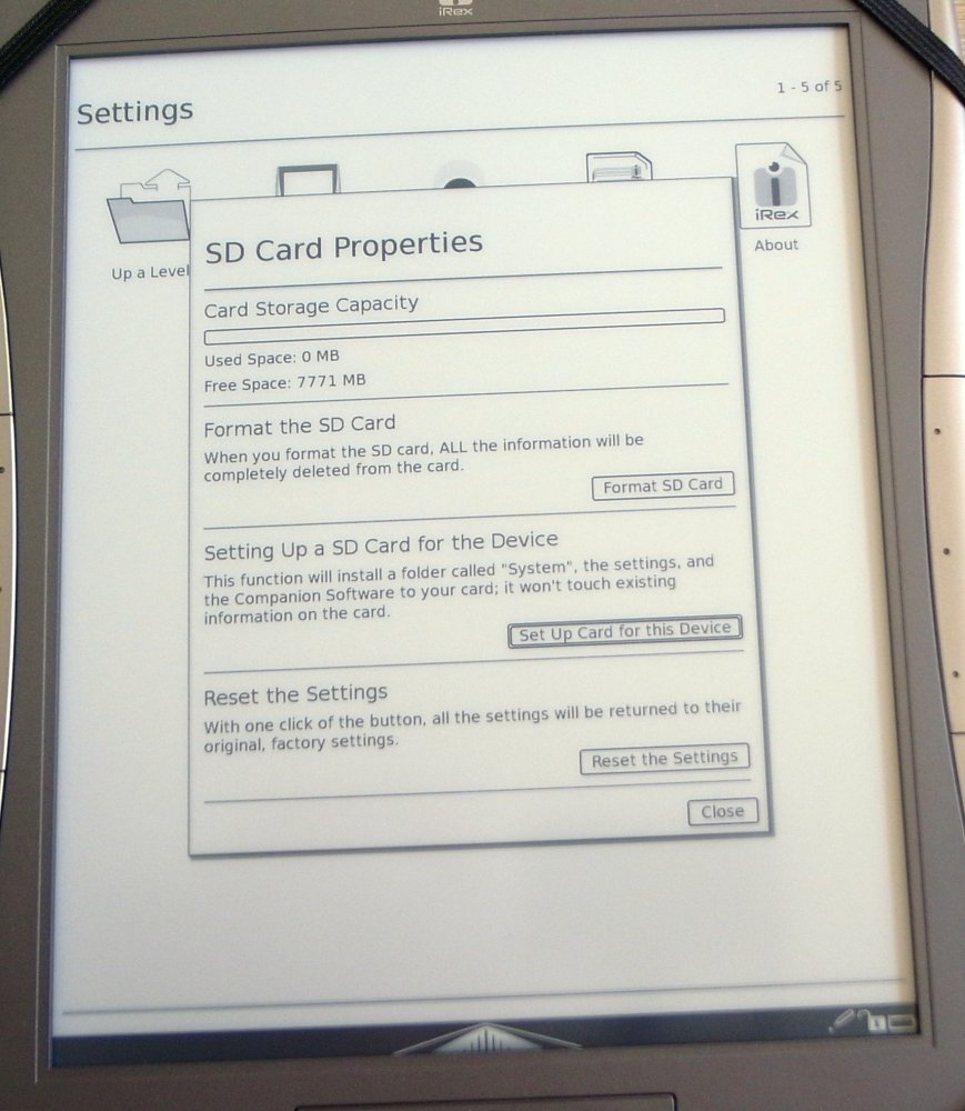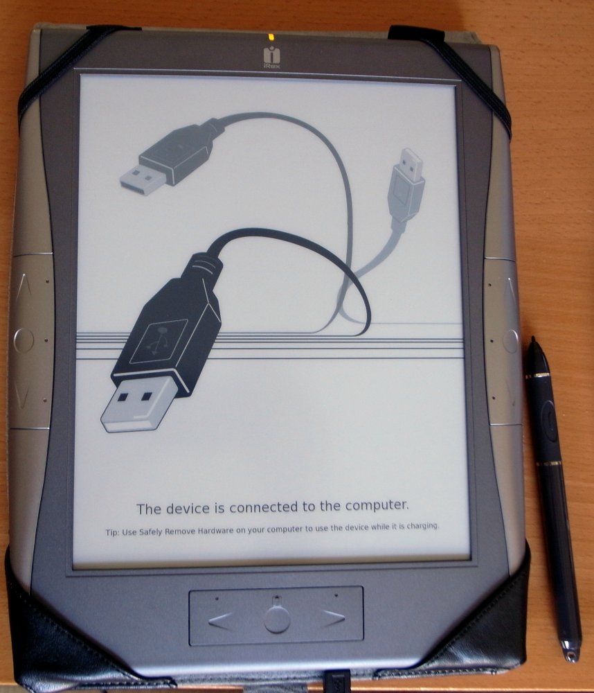 I ordered the DR1000S and Deluxe cover from eReader Outfitters and the accessories from iRex directly. Through some coincidence, they arrived together (good thing, since the Deluxe cover is not available... yet) If the DR1000S is big, the (cardboard) box is gianormous ^_^; It came with a "Reader 101" sticker covering the screen, and still had enough charge left for me to play around with. It's certainly the snappiest e-ink reader I have used, esp. with PDFs (not that I have any love for that format, on the Sony the newly-introduced oddball reflowing just isn't much good...) It has so far opened every file I have thrown at it, the first time you opened it it may take a while, but after that it's much faster. As an avid comic/manga fan, it is nice to just throw a folder of uncompressed images on there (no compressed folders yet) and read away, fast and almost always without scaling since most images are in the 1100-1200px height range. Add to that the fact that this screen uses 16 grayscales on top of the high resolution and a PROPER FULL SCREEN MODE and the result is simply outstanding, even for photographs. The Screen is slightly lighter than my Sony, maybe it's the actual e-ink tech or maybe it's because my Sony is older... in practice it doesn't make much of difference though. The weight is perfectly OK, but in bed I'll continue reading on my Sony because of the small size and the added light. The cover is nice and solid, even though the fake leather is easily scratched. Inside there is space for the pen on top (the elastic bands are two sizes, presumable to fit either pen), space for some creditcard (or the much needed reset-paperclip in my case -_-) and some paper behind it. For some strange reason the iRex logo is on the BACK (?) so I tend to open it the wrong way... The pen (interface): I still have to get used to the fact it's there at all ^_^ I have locked the right-hand side of the sensor keys since I keep hitting them with my palm while I use the pen. I have included an image of the included pen, the "professional" pen and the current-gen Wacom pen (which doesn't work - not the same tech) The Pro pen is very comfortable and has at least one button (which isn't used yet, like the eraser on the back) Sketching is pretty much out (I had some hopes for that) It's too slow, but I'm not entirely sure it is strictly due to the screen tech. Weirdly enough, it's all vector based (like Flash or Illustrator), and not a plain bitmap sketching app (like Photoshop or Gimp) It is clearly visible when you use the eraser: it erases entire lines at once, rather than the area you rub on. This also explains the absence of pressure sensitivity and grayscales (it seems the reader has enough trouble keeping up with drawing a fixed-width black line) I hope they will either change it, or there will be a sketching app at some point. I think the hardware is capable enough. The interface in general works pretty well for me. I too get thrown off because the bottom sensor pad central button is ALWAYS the menu button and not an "Enter" key like the other ones. That is true in landscape format too, whichever "side" becomes the bottom, also becomes the Menu button. The PC software is useless, as in -not working at all as described-, but also as in -superfluous-. I still have to figure out what good the "My iRex" account is, maybe once the functionality is fixed in the software. Last but not least, some screenshot of the SDHC card issues (they mostly work, but you can't format them on the device) The "setup card" works as well, but as others have pointed out, that does not include the large files on the original card (PC software, Manuals) Download these directly from iRex if you accidentally deleted them. Charging: Despite the huge price tag, no charger... bleh. I have successfully used my Garmin USB charger (for their GPS devices) It's very compact and comes out of the box with most international plug adapters, which is really nice. I think that's enough for now. Ask away. |