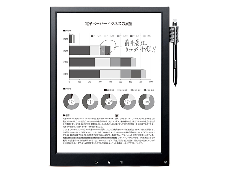 It will be released in a weeks time, release date is set for Dec 3. The screen is, in Japanese, electro-magnetic conductive touch panel with pen support. I assume that could either be N-Trig or perhaps Wacom. It is 1200 x 1600 pixels with support for 16 levels of gray scale. Memory is 4 GB with 2.8 GB available, it comes with a microSD card slot and a micro USB port (an OTG cable should make it possible to use regular USB memory sticks). It has a lithium-ion battery that will charge in 3.5 hours connected to a computer and 2.5 hours connected to the included charger. It comes with one stylus, 3 exchangeable nibs, 1 nib remover, 1 charger, 1 USB cable, 1 sleeve case, 1 Quick Start Guide, 1 Basic Usage Guide and 1 Manual. |