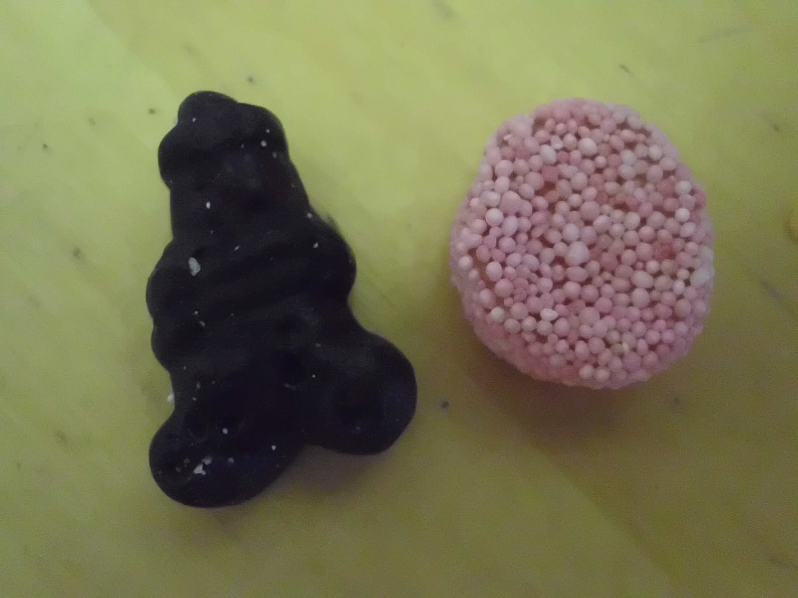 It's actually a very dark blue and is more of a liquorice flavoured hard jelly type thing. The other one is a sort of clear liquorice flavoured jelly covered in sweet bits (it comes in blue and pink). That's my second favourite.