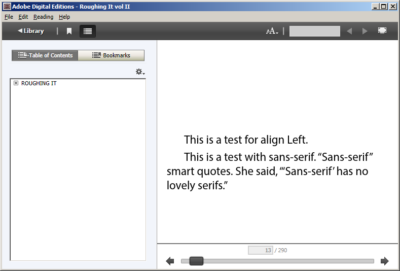 The problem is that when she looks at one section of the ebook with ADE the sentences seem to run together, particularly when there are quotation marks. When I look at the same material with the Sony desktop reader, a Sony ereader, a Kobo Touch, an iPad with iBooks and with Marvin, and the calibre reader I don't see any problem.