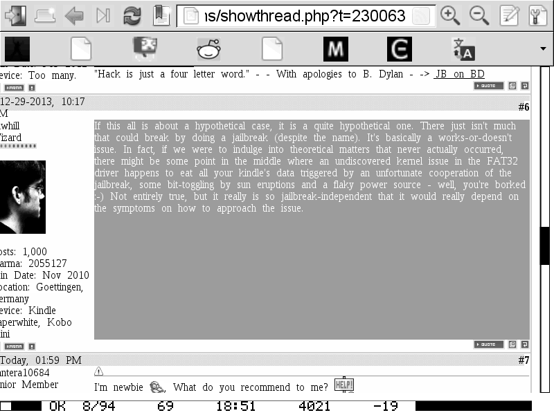 Two things makes it useless for me: 1. Some apps are in background. During start off dictionary.mobi the device stops and no response. The "/usr/bin/wua -l com.lab126.acxwua -s com.lab126.acxManager" (*.mobi) starts only after I close through ssh all apps in background. 2. Ctrl+c crtl+v doesn't work between apps. No clipboard on OS. I would have to additionally create something similar but I've no idea how without interference in apps. Maybe I'll use this information in a different way. For something usable. Thanks. |