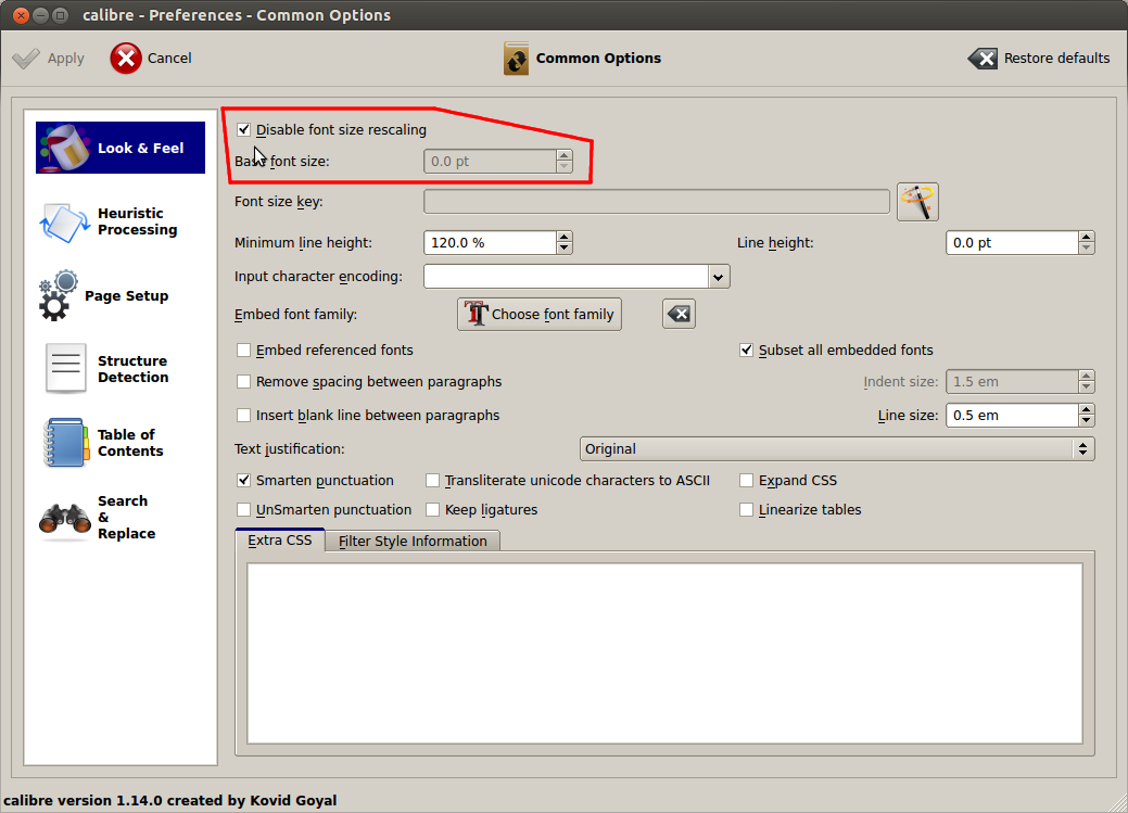 It is a conversion option ![]() Remember ![]() Preferences: Common Options Sets the DEFAULT for new books If the book has been converted, THOSE settings are remembered, so you have 3 choices: 1: Use the "Restore Defaults" button at the bottom (single book mode) or Tick at the top (Bulk mode) 2)Change the setting in the Look and Fell section of the Conversion Dialog 3: do nothing, it is too scary