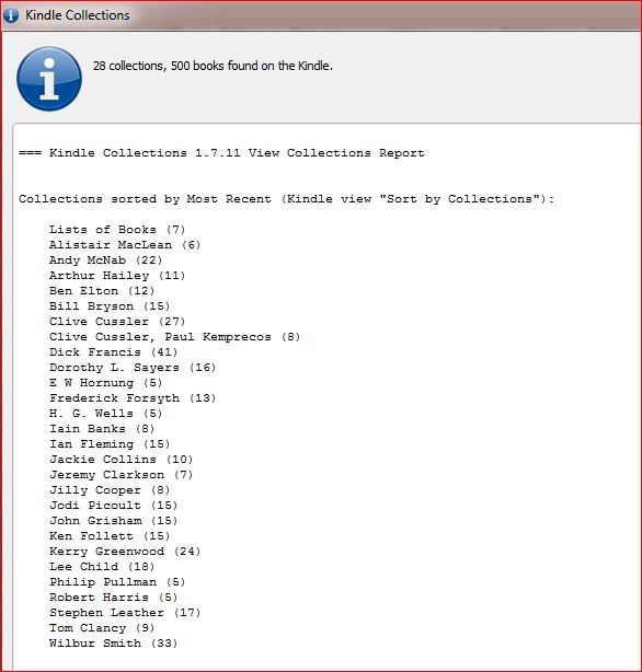The first screen shot (CM1) shows my settings and options for the Create function. The second screen shot (CM2) Shows my manual selection just before clicking the 'save' button. The third screen shot (CM3 View Report) shows the results from 'View Report', where the manually created collection appears as the first in the list. The fourth screen shot is the detail of the collections created by the 'Save To Kindle' function - and the manually created collection is not there. After running Collection Manager's import on the Kindle Touch, the manual collection does not appear on the Kindle although all the rest do.