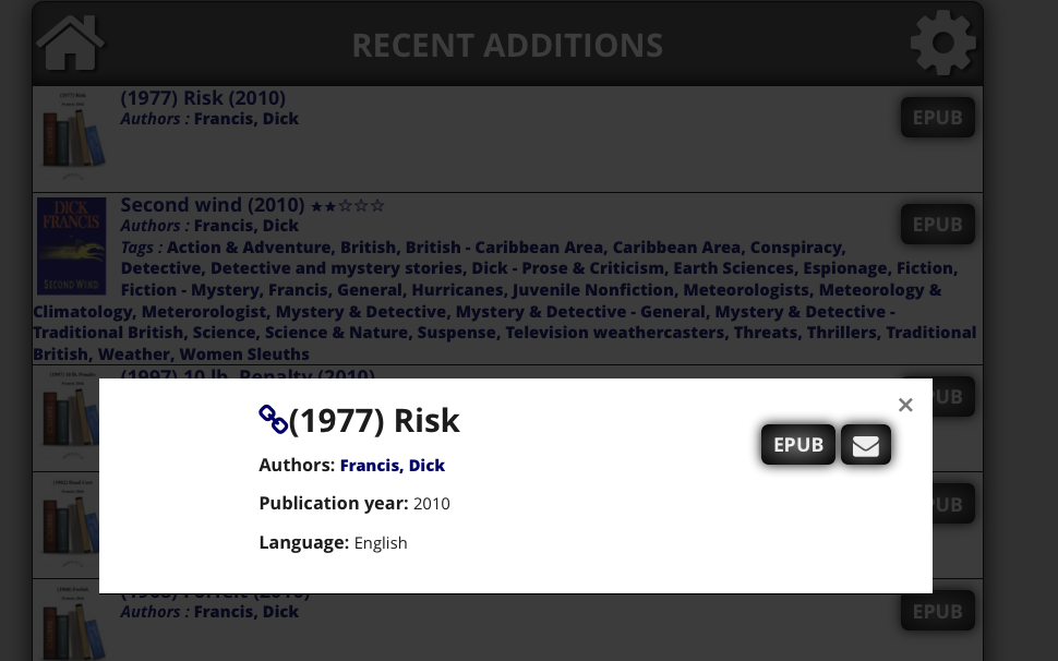 I do seem to have one issue. My books are all available and everything seems to work correctly. I can see buttons to download EPUB or MOBI formats and that's all working with no errors in the log. However, I don't see an 'email book' button anywhere in the interface. I have entered an email address in the COPS settings page. Is this feature not implemented yet, or do I have a problem in my setup ? I'm running COPS 0.6.2 installed as a package on a Synology Diskstation DS112+ with DSM 4.2-3211. the issue occurs on Chrome, IE and Opera Probably I'm missing something obvious - so any pointers greatly received |