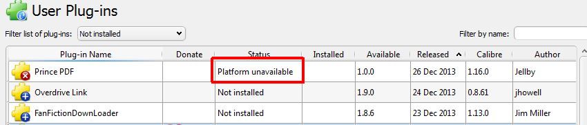 Assuming Prince is installed in the default location, the cli program will be at 64bit Windows ==>> "C:\Program Files (x86)\Prince\Engine\bin\prince.exe" 32bit Windows ==>> "C:\Program Files\Prince\Engine\bin\prince.exe" The conversion works - a PDF is produced in the right place and the database is updated to 'say so' and I can open the book (in my PDF reader) via the View feature in calibre However, when the update is finished the Formats 'column' in Book Details doesn't show a PDF. The Book Details panel probably needs to be refreshed, if I make another book current and return to book just converted the PDF is shown. I'm not bothered by the missing icons - but other PI's have their icons in the their images folder, that folder is empty in the Prince PDF.zip. I'm still seeing the aberrant second item in my taskbar. I've got a heavily tweaked taskbar so when I've done my morning chores I'll turn the tweaks off and have another look. It's most unlikely that the tweaks are the cause the of the aberration, but their lack may make it easier to diagnose. BR Last edited by BetterRed; 12-27-2013 at 04:02 PM. Reason: clarity |