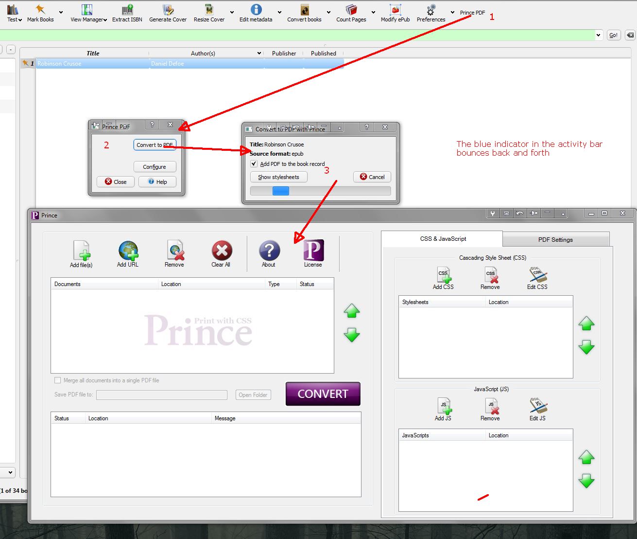 But note that Prince is a command-line tool. Every window you see is the plugin (or calibre). When you say you closed Prince, I guess you mean you closed the conversion window (ss4.png). Anyway, when the process is cancelled (or it fails) there should be no further attempt to access the pdf file. Do you see a "View log" button in the main plugin window after this happens? If you do, please click it and post what it says. Otherwise, I'm afraid I'd need a more detailed description on how to reproduce this, since I cannot see what could be going wrong at the moment. |