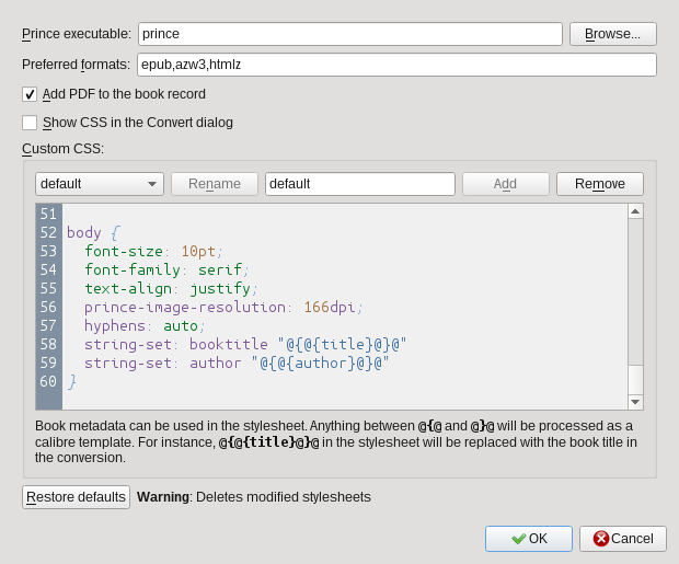 <meta name="prince-style" content="pdfoutput_css" /> So far, it has only been tested with ePub files and in Linux (and to some extent in Windows). If anyone tries it with other formats and/or in other platforms, please notify me of any issues. Special Notes: