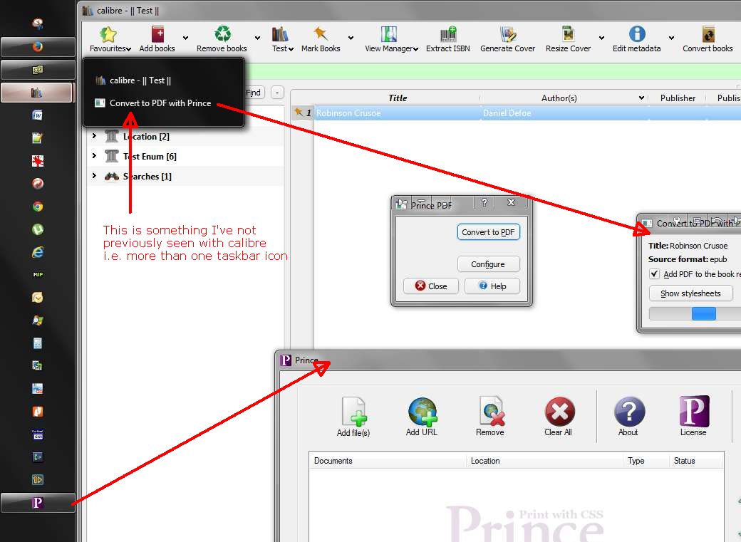 The aberration is another instance of the calibre process - sort of I get exactly the same with my mail client. when I hit the reply button it opens a Reply window that shows as another item in the taskbar, which gets grouped (that's a Windows setting not a 3rd party tweak) with the main icon. And the Reply window shows as a separate Application, but not as a separate Process. So I'm assuming the 'aberrant' taskbar icon represents the prince.exe program I'm OK with it now, but it may 'disturb' other Windows users - on the other hand they may not even notice it ![]() So... bottom line is that it's ready to go in Windows (icons aside). I wont be doing any quality checking of the output PDF - just thought I'd help by doing some basic 'does it work' tests. Cheers BR Last edited by BetterRed; 12-27-2013 at 07:08 PM. Reason: grammar said to |
