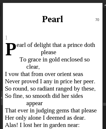 div.poetry div.line { padding-left: 3.5em; text-indent: -3.5em; } span.drop { float: left; margin-right: 0.5em; text-indent: 0; } span.drop span { font-size: 300%; font-weight: bold; } div.poetry span.drop { margin-left: -3.5em; margin-right: 4em; } span.drop + span.first { margin-left: -0.5em; white-space: pre; } <div class="poetry"> <div class="line"> <span class="drop"><span>P</span></span><span class="first">earl</span> of delight that a prince doth please</div> ... In the process, I noticed another ADE bug. When I tried to move a drop cap image up (third screenshot), it didn't work. Apparently ADE does not like "position: relative". I then tried setting a negative margin-top, and lo and behold, that only works if I have a border! So I had to use something like this: Code:
