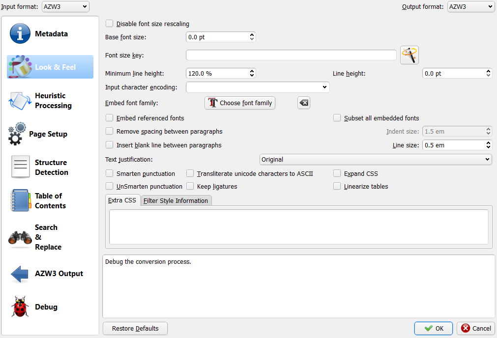 You can also use this when converting epub to epub if you want to use your own font in say Moon+ or Mantano. I also add line-height to the other CSS properties box in the same tab this removes all line height references from the style sheet allowing you to set your own on your Kindle or epub Reader. I do remove Margins so I can set mine as well but that is a user preference. |