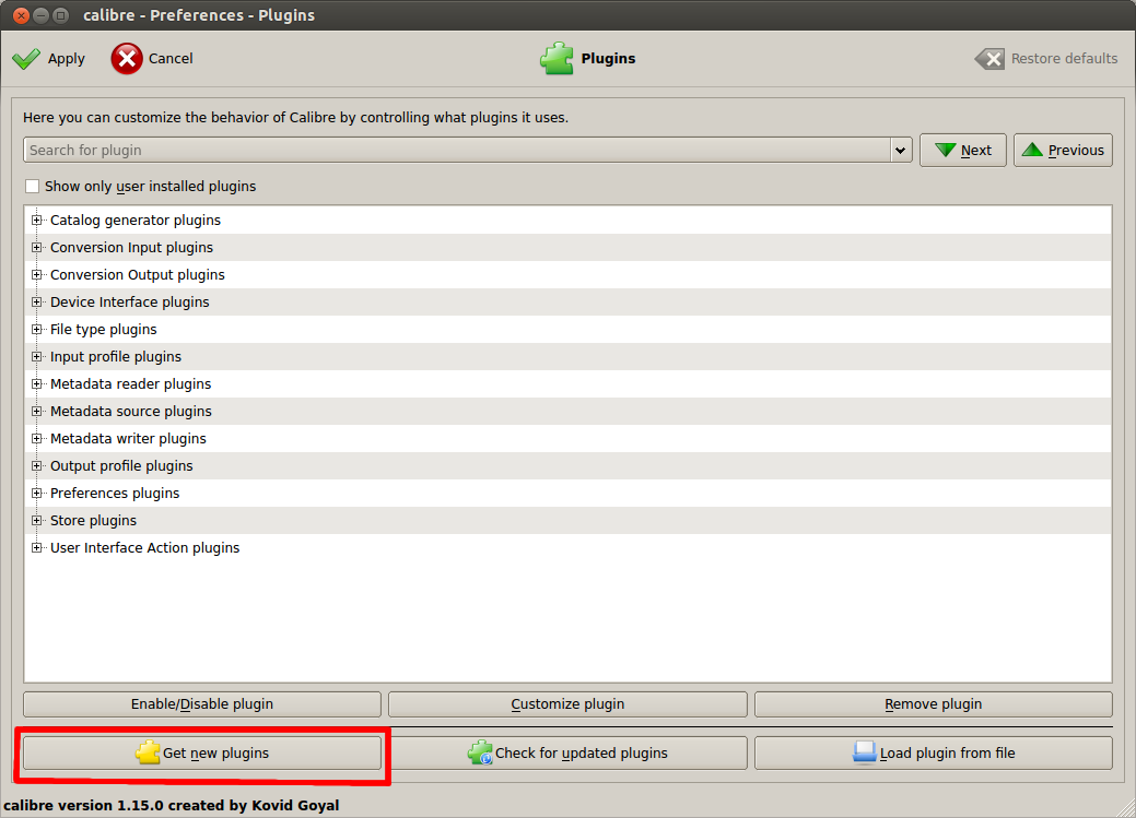 From preferences on the toolbar select "Get Plugins to enhance calibre". This will involve the User Plugins; "Opens a new window that shows plugins for calibre. These plugins are developed by third parties to extend calibre‘s functionality."