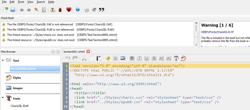 If I delete a style sheet, I'd expect that the now invalid links would be deleted. After all, I could add new ones and relink. There is a Link Stylesheets option to delete current ones so I use that The biggest 'un-learning' I've experienced from Sigil is the difference in folder structures: Sigil put .ttf's in ..\Fonts\, .css's in ..\Styles\ etc. If I open and edit a Sigil epub in Calibre Editor and add files, the folder structure and links get a little confused being in different paths Starting with a clean Calibre empty book and adding files does not cause problems, although (being an old dog) I prefer the IMHO more structured approach from Sigil. Paul |