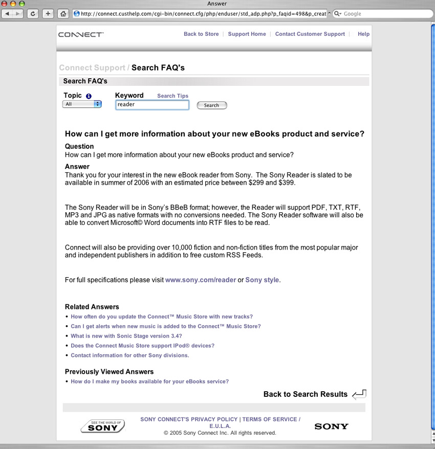 Some intesting datamining is in help section: http://connect.custhelp.com/cgi-bin/...GV4dD1yZWFkZXI "Connect Support / Search FAQ's Search FAQ's Topic Keyword Search Tips reader search Question How can I get more information about your new eBooks product and service? Answer Thank you for your interest in the new eBook reader from Sony. The Sony Reader is slated to be available in summer of 2006 with an estimated price between $299 and $399. The Sony Reader will be in Sony’s BBeB format; however, the Reader will support PDF, TXT, RTF, MP3 and JPG as native formats with no conversions needed. The Sony Reader software will also be able to convert Microsoft© Word documents into RTF files to be read. Connect will also be providing over 10,000 fiction and non-fiction titles from the most popular major and independent publishers in addition to free custom RSS Feeds. For full specifications please visit www.sony.com/reader or Sony style." Last edited by TaKir; 04-18-2006 at 04:58 AM. |