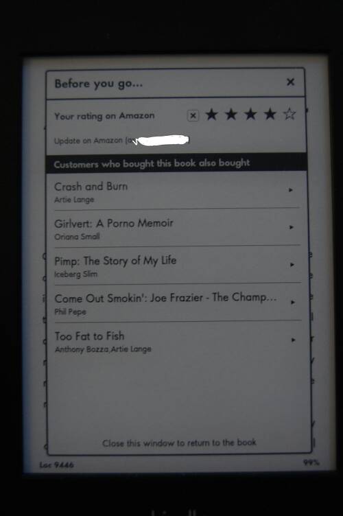 And the popup for rating the book only shows up after you've finished the book, when I usually just press the home button at that point anyway. I don't have a moral objective to seeing the popup if it doesn't hinder my getting out of the book. On sideloaded books, this popup is at the 100% (location) mark, on Amazon-loaded books, it is wherever Amazon's algorithms say the end of the book is. Which is very often before end matter, previews, and extra material, like short stories. Fortunately, I discovered the data is all saved in /documents/{book-title}.sdr/EndActions.data.{ASIN}.asc, so I searched and deleted them all. Since I backup my Kindle for weird reasons, rsync is set to prune out all files containing "EndActions". And a KUAL hack which turns off the popups via the settings database now includes (on my suggestion) a button to "rm /mnt/us/documents/*/EndActions.data.*.asc" for extra security. This might not suit everybody, but I find it makes for a happy Kindle reading experience. YMMV.