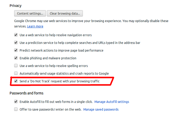amongst the "small print" .It was introduced in the November 2011 release. But, I believe, that it relies on the presence of the Do Not Track Header at the site (I think Firefox is the same), if it exists and for which there is no standard. Consequently Google's weasel words about its (non)effectiveness. I believe that IE also now recognises the DNT header (since IE10??), if it exists, but it certainly continues to use its original user downloadable and controlled lists of sites, to which tracking information is actually blocked, as well. |
