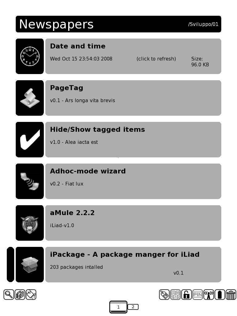 A package manager should be included in the iLiad software (like apt/aptitude in Debian), to make it easier to install new software and updates from this single repository. Maybe we could port the GPE Package Manager (a graphical front-end for ipkg, http://gpe.handhelds.org/projects/gpe-package.shtml). I'm willing to look into it, but currently I have a lot of projects that I want to spend time on. |