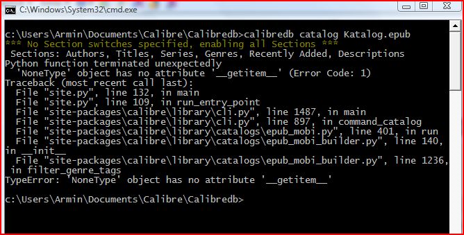 something is going wrong with command line interface 'calibredb catalog' in windows. I can do things like: 'calibredb catalog Katalog.csv --fields=authors,title --sort-by=timestamp' However, what is not working is i.e. 'calibredb catalog Katalog.epub' where I get this error Spoiler: