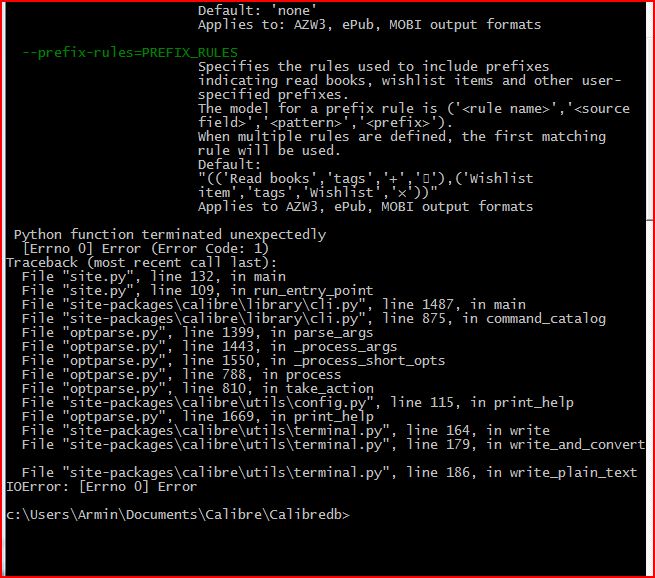 I got this python error if I use the help-option (calibredb catalog file.epub -h) at the end of the report. |