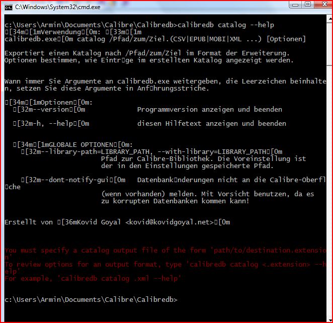 please see first picture. If I add '--fields=authors' I got only new errors. Guess it is not for epub and applies only for csv and xml? An additional point, if I do a help request, the printed output looks very ugly. i.e.: 'calibredb catalog Katalog.csv --help' (second picture) I'am a bit lost on this. Is it me or an error? |