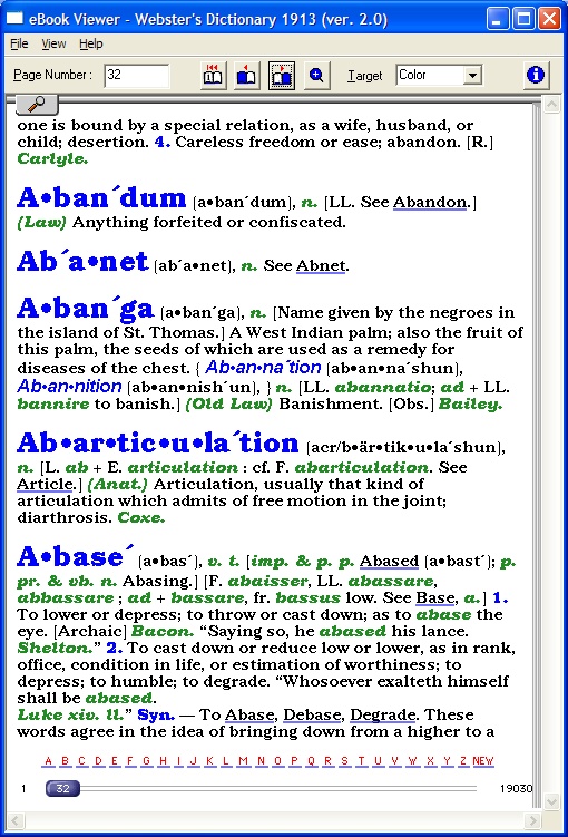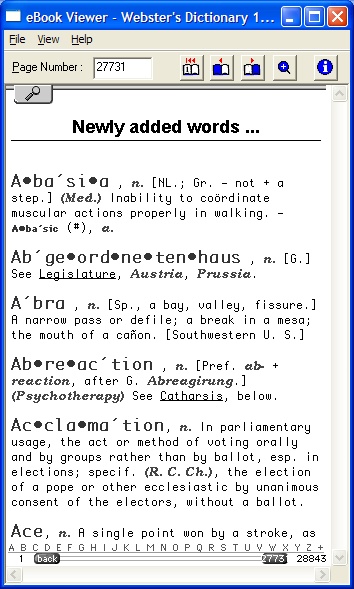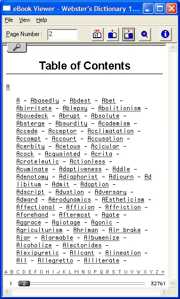 I automated the process to add TOC entries into a two-tiered TOC. I ended up adding just over 2600 TOC links. The idea was to space them evenly over every 50 words and then the mid point would be no more than 25 words from either side (word_before TOClink or word_after TOClink). With an average of (say) 5 words to a "page" that would mean the mid point would be only 5 page-turns away! Now, the exciting news (for the REB1200 version ONLY), all words referenced in a definition (i.e. Abase) like 'See Base' are now hyperlinked to that entry in the dictionary; some 50,000+ new links have been added by me! Unfortunately, the EBW1150, cannot handle this many links, so I've limited the EBW1150 version to only contain hyperlinks to words that are 7 letters or greater! This reduces sufficiently the number of links and can then be made to work with the EBW1150. I could not increase the number of hyperlinks by adding 6+ letters or less as it stopped working if I did. Again this only refers to EBW1150 version and the words referenced "inside" a definition; not the main words linked from the TOC! This conversion from .html to .imp takes siginificantly longer, about 3.5 hours! Even though this is a 100 year old dictionary, I hope you find it useful. I know some people will probably read it like a book.... ![]() BTW, did I mention IT'S HUGE. HOW TO INSTALL FOR EBW1150 users You need both parts 1 & 2 of the 'Websters Dictionary 1913.imp' zip below (the 1st & 2nd attachments below). The .html source for this ebook is included separately (the 3rd attachment below). FOR REB1200 usersNote the EBW1150 .imp ebook was produced with the 'View with Small Font Only' option so that it would work with the EBW1150's more limited memory. Also, when reading a definition and it refers to another word, the link exists only for referred words that are 7+ characters in length. This was a trade-off to allow this .imp ebook to work, as 6 character or less words just constantly rebooted the reader. Also, the first time you use a link within this .imp ebook, you may get a message that Your eBook has exhausted an internal resource... and the unit says Restarting.... Just try again as the EBW1150 just freed all available resources so as to allow the links to work now! You need both parts 1 & 2 of the 'Websters Dictionary 1913_1200.imp' zip below (the 4th & 5th attachments below). The .html source for this ebook is included separately (the 6th attachment below). Then using HJSplit or similar just combine the two parts after unzipping them i.e. .001 and .002. If you don't mind using the command prompt, type the copy command below:Aside: The REB1200 source .html can also be used with the attached wordlist (the 7th attachment below) hyperlinking all 110,875 words into the main dictionary .html. This can be used to create a new/different tier-two TOC instead of using just every 50th word! Code: