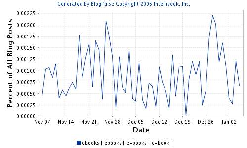 Here's something interesting that goes along with this debate: Take a look at these searches at Technorati.com for the terms ebooks , e-books, and "ebook OR ebooks OR e-book OR e-books then note the small graphs on the left that show mentions by day for the past 30 days. There appears to be quite a spike for the term "ebooks" over the last few days that coincide with the Sony Reader announcement at CES. I'm trying to figure out a possible reason for the spike on 12/20 for both "e-books" and "ebooks", any ideas?? I wonder if the noticable spikes in the terms "ebooks" and "ebook OR ebooks OR e-book OR e-books" around the end of December and over the last few days are due to the original story by BusinessWeek on the 29th about Sony's plans and the subsequent announcement at CES?