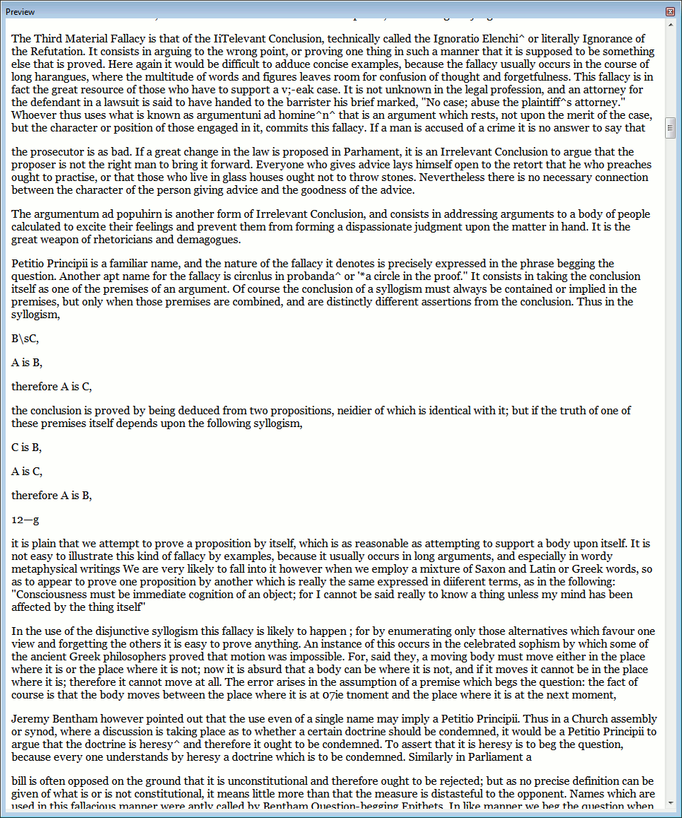 https://www.mobileread.com/forums/sho...d.php?t=223817 If you just want to have a (crappy) OCR text backend on PDFs that you release, then running it through Finereader should be ok (this would require minimal manpower). This can also give you an "ok" search option through the text of the book. This is what archive.org does with all of their scans, but you can see the horrors if you ever downloaded one of their "EPUBs". Manual Checking of OCR: Depending on the quality of the scan/image, you can probably go at a pace of ~15-200+ pages an hour. Slowest: HORRIBLE quality/badly marked, very dense text, lots of footnotes/figures/formulas Fastest: Purely clean, no markings, no writing inside, crisp text, simple (like a novel). Although your pace might be EXTREMELY slow when you first start out (when I first started, it used to take me a week or two to fully digitize one book). Example: One of the books that I worked on converting was "Elementary Lessons in Logic" by William Stanley Jevons (cleanest Archive.org PDF here): https://archive.org/details/elementarylesson01jevo If you download the Archive.org EPUB edition, you can see the OCRed text backend: https://archive.org/download/element...son01jevo.epub Take, for example, Page 178-179: https://archive.org/stream/elementar...e/178/mode/2up Here is the section in the Archive.org EPUB (this is the OCRed text backend): Side Note: Keep in mind, this PDF is an example of an old book that is QUITE clean. There are HORRORS out there. Quote: