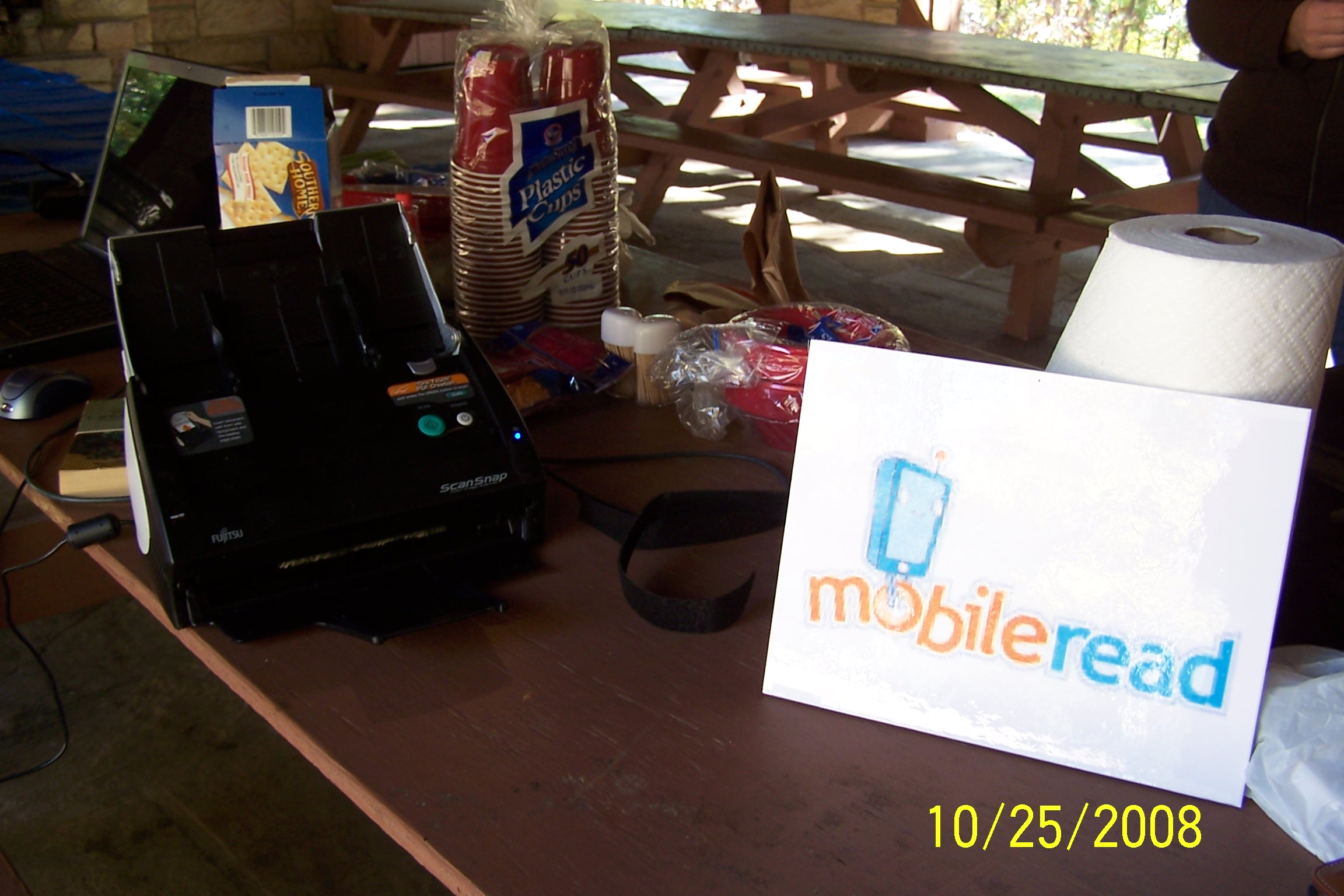 Slayda and bmwVan found their bliss quickly. They were trying to do something pythonish, but my eyes glazed over and I went for more chocolate. Earlier, Slayda took us to the trunk of his car and sliced apart a pbook while demonstrating his able-to-slice-off-a-whole-finger cutter, then back to the pavilion, where he showed us all his amazing double-sided scanner. His daughter, Miss S, timed him - took 16 mins from pbook to PDF. AMAZING!!! My darling hubby, Tim, liked that gadget best of all.
