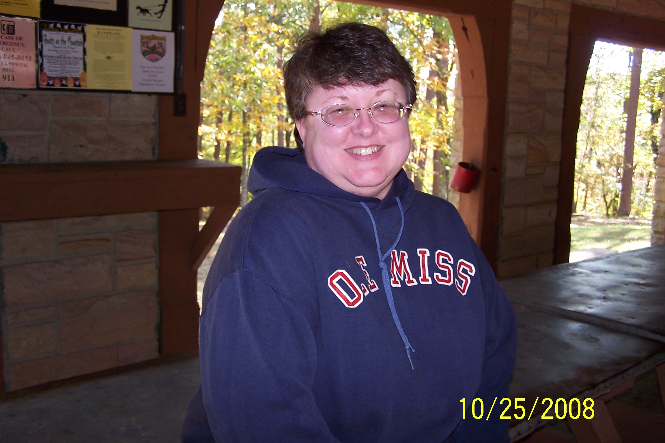 Dixie Gal? Blue sweatshirt with 'ole Miss' on it? Because of the glasses....