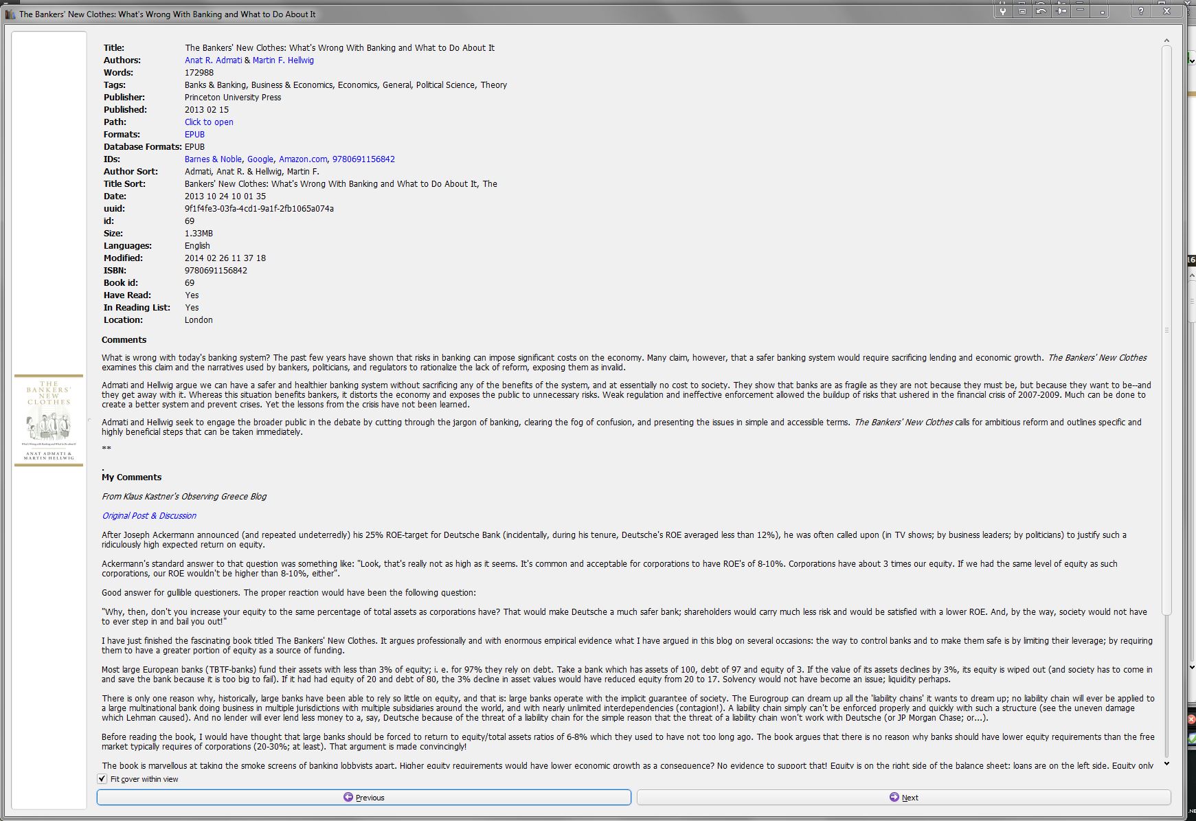 You can also display it as a column in the book list, if you do then I suggest you hide it with an icon, see second attachment. Then if you press F2 on a My Comments cell in the book list you get what you see in third attachment (sans my silly text of course). Added : Whilst redoing the snaps that the MR dog ate (twice in the same thread), I did one of a real sample of how I segregate the wheat from the chaff BR Last edited by BetterRed; 02-25-2014 at 08:40 PM. |