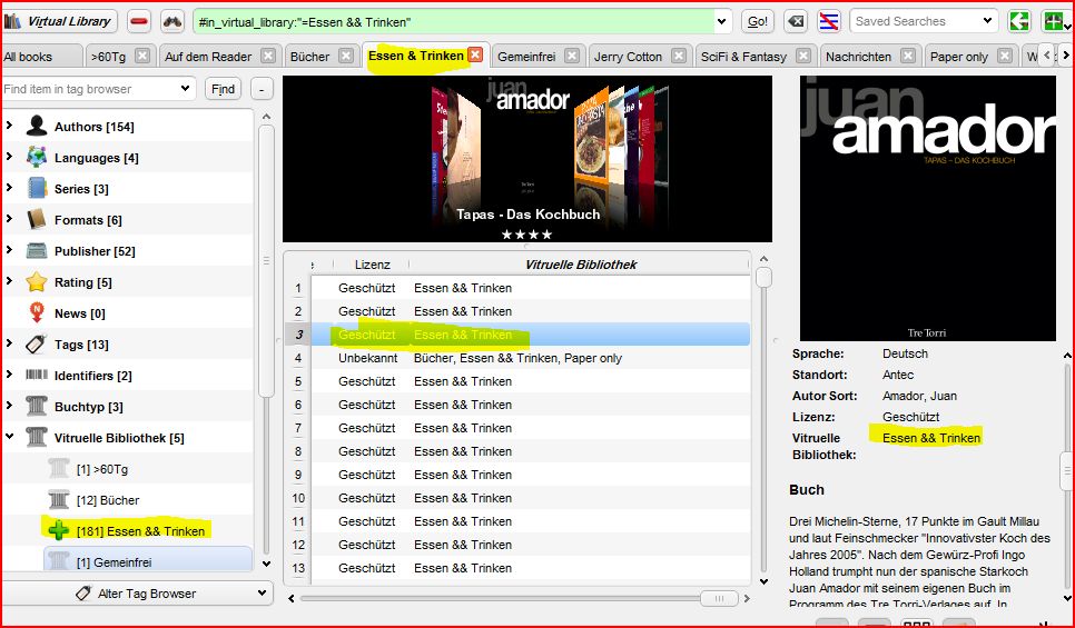 there seems to be a little problem with virtual libraries names containing an ampersand. The displayed names are wrong with double ampersand instead of one. An example: Virtual library name: Essen && Trinken Display name in calibre library Virtual libraries tab: Essen & Trinken -> ok Display name in tag browser: Essen && Trinken Display name in book details: Essen && Trinken Display name in custom columns: Essen && Trinken Display name content server: Essen && Trinken Display name content server feed-view: Essen && Trinken Last edited by Divingduck; 02-27-2014 at 12:42 PM. |