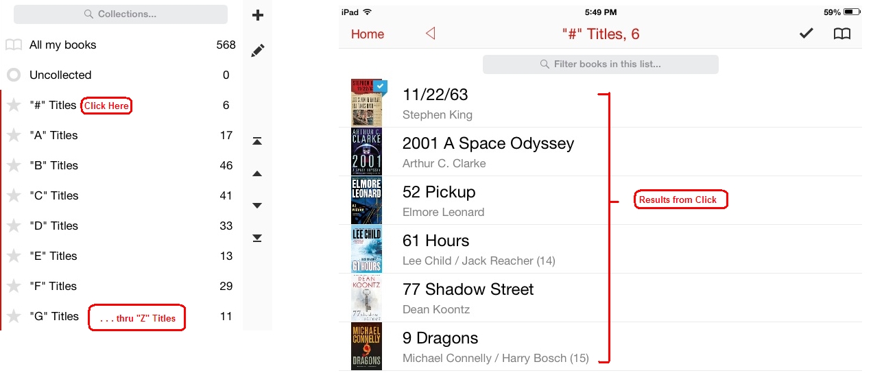 As my calibre library keeps growing, I find calibre's Tag Browser function that shows all Titles beginning with a specific letter quite useful. Only two clicks are needed, one on “Titles” and another on the letter I want. No need to scroll through dozens of screens. In Marvin, even with “All my books” pinched into condensed mode, I can see only 12 titles per screen on my iPad Mini. It takes a bunch of scrolling to maneuver through 500 books. Possibly, I'm overlooking an easier method to jump to titles beginning with a specific letter. I’ve created 27 Custom Collections in Marvin to do this job. However, a new Smart Collection for “All my books” would be quite handy. It could be similar to the Smart Collections for Author and Series that expand into an alphabetical list. The attached screen capture might help clarify what I’m talking about. Regards, Marty |
