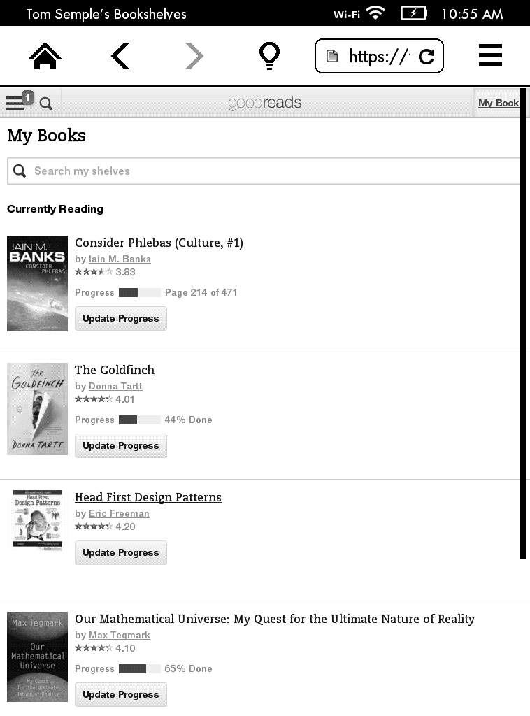 What would you change/add? One thing I don't like is that once you've linked Goodreads, you MUST share with GR even if you just want to share on FB or Twitter. I'd like 3 checkboxes so you can select whatever combo you want. The other thing (and this is just a general complaint about scrolling views, web browsing, etc. on the Paperwhite) is that it forces you to swipe to advance the scroll, with no way to jump to the end or in between. It can get rather tiring. The web browser is particularly bad as it takes a very exaggerated swipe to simulate page up/down. For example (since we're talking about GRI), the Add Amazon Books list is particularly long and therefore pretty useless for adding books that are near at the top of the list, with no way to search or sort it. There's a thing that looks like a scroll bar, but you cannot interact with it directly to move to a different position in the list. I'd sacrifice a little screen real estate for navigation buttons, or maybe add some tap zones for better navigation. The only exception to this I've found are the Kindle Store listings, which do respond to touch on the scroll bar to page up/down (really got to wedge your finger on the edge). Last edited by tomsem; 03-09-2014 at 07:05 PM. |