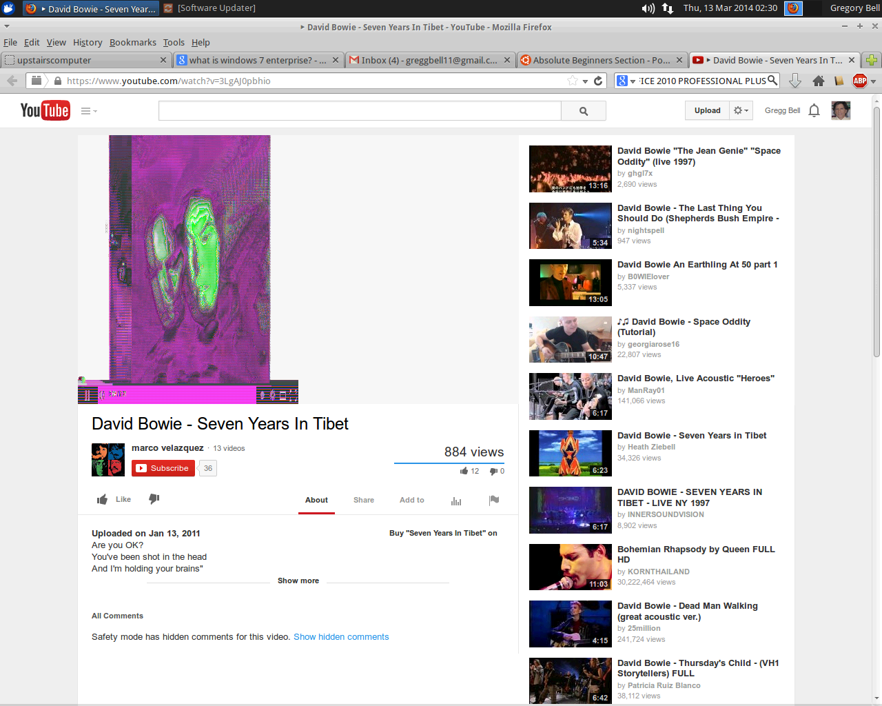 I've been trying to figure out this problem of glaring neon-like colors when I watch videos (see screenshot). I've tried uninstalling and then reinstalling the Adobe Flash player. I've tried upping the screen size by hitting F11 and then right clicking on the video, choosing "settings" and then hoping to uncheck "enable hardware acceleration" but it would not let me uncheck it. Someone helped me go into the nano editor and add EnableLinuxHWVideoDecode=0 to the Adobe file. That didn't work either. My latest thought was to try to force install the latest Adobe Flash Player in the Synaptic Manager but then I got warnings that I might damage dependencies. Anybody have any suggestions on how I could overcome this issue? Thanks. Gregg (still on the nearly interminable adventure) p.s. Computer is Dell Optiplex 170L (32 bit) processor is Intel Pentium (R) 4CPU 2.80 GHz distro is Xubuntu 13.10 |