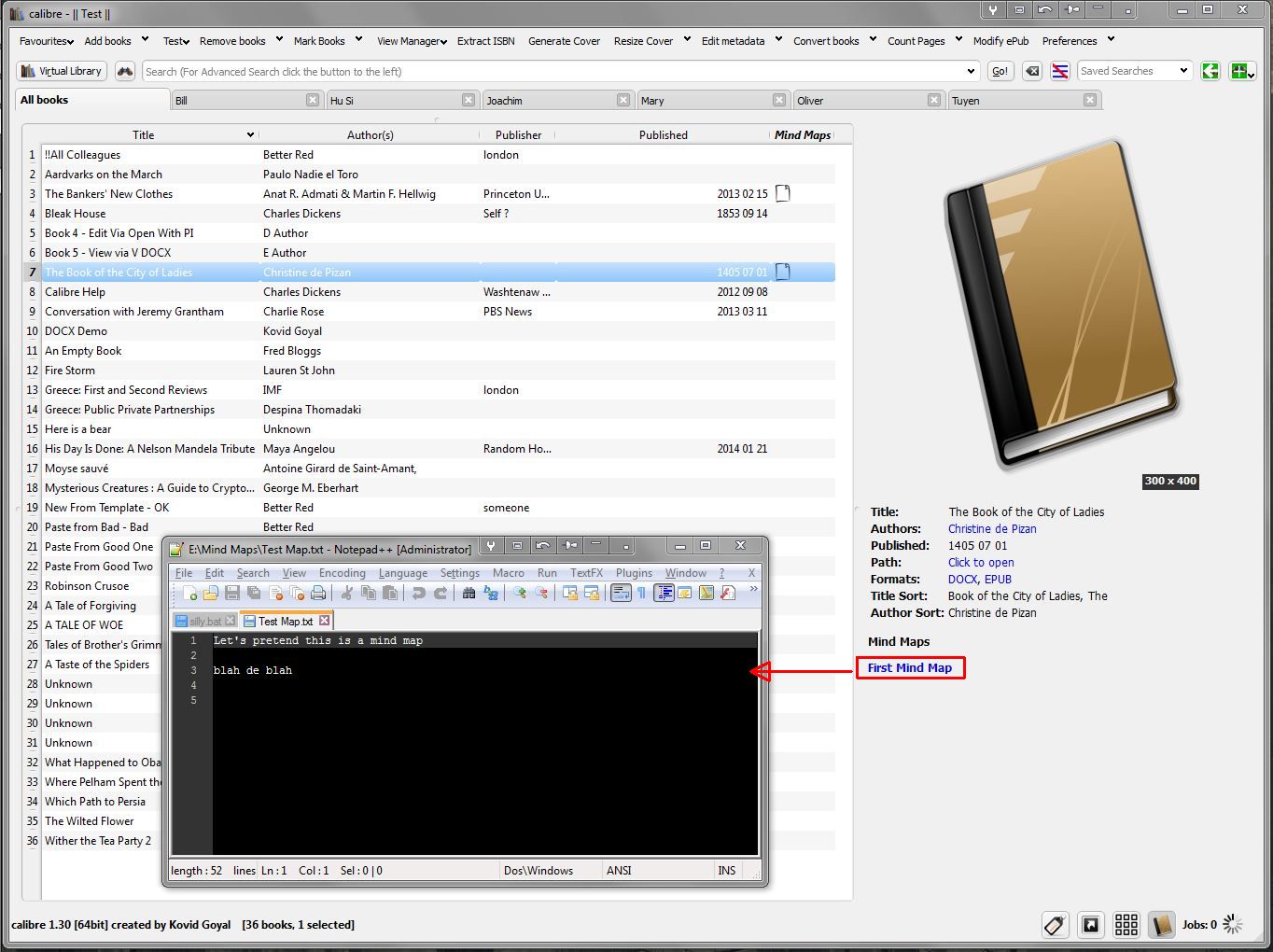 I created a folder on my E: drive called Mind Maps, see Capture1, it has one file called Test Map.txt In my Test Library I created a custom column named Mind Maps, see Capture2 Custom Comments columns can be shown as a columns in the Book List, but due to their very nature they're not very pretty - so I put them behind an small icon - this is done in Preferences->Look and Feel->Column Icons see Capture3 (I will put the icon file I am using here as the last attachment - IMO best results are square 128x128 png files with transparent background) In the book list I highlight the Mind Maps cell in a Book, press F2, and the free standing Comments editor pops up - see Capture4 Now I enter data into the Mind Map cell, I enter a header "Mind Map" then I use the Link Widget - see Capture 5 In Capture 6 you see the result - I put the Mind Maps Column in Book Details, so I click on First Mind Map (the label I entered for the E:\Mind Maps\Test Map.txt in previous step) and up pops the Test Map - in my case its a text file, so Notepad++ pops up Hope that helps BR Last edited by BetterRed; 03-28-2014 at 08:20 AM. |