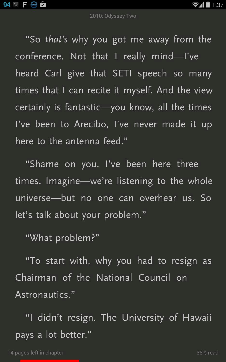 I could do without the book title and progress though. ![]() EDIT: I see now what you guys are talking about. I'm still getting a fair lot of text with bigger fonts on the iPad. Last edited by Jessica Lares; 04-19-2014 at 10:14 PM. |