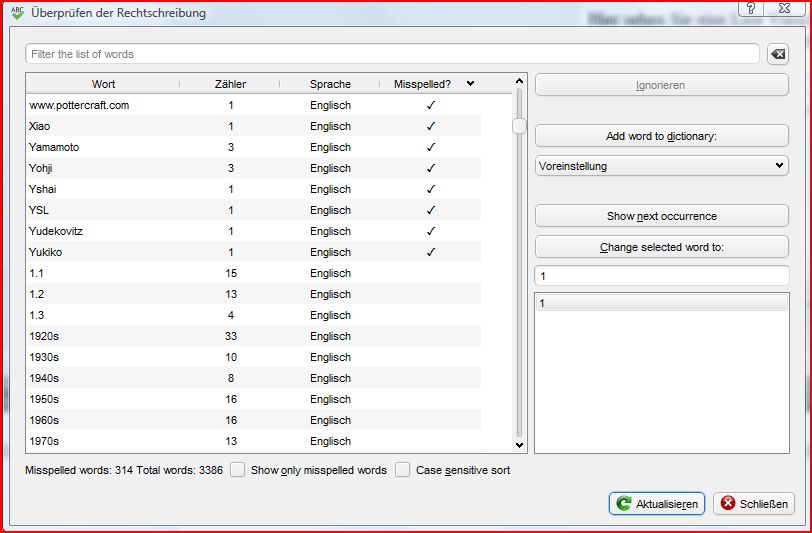 However, whether the following is an issue or just that I haven't worked out the interface I don't know, but if one clicks on a cell, say in the Word column, the red border appears. If one then clicks on another cell in the same row but in another column, say Count, then the red border doesn't necessarily extinguish on the previously clicked cell and so on if one then clicks the Language cell, say. But a further click on a cell may (I think maybe always does) extinguish the previous red borders on the other cells.