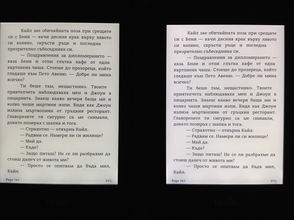 So far, I've been reading on a Pocketbook Touch Lux. Compared to the Kindle it looks quite slow and grey. I can't believe how bright the Kindle is! I put the two screens next to each other with full lights on and they were worlds apart. However, my PB has an even distribution of light whereas my Kindle has a shadow on the bottom left and a very bright spot on the bottom right. Reading during the day, it doesn't annoy me as much as I first thought it would. That's why I'm keeping it, escpecially after reading comments about dust under the screens or tilted screens. Luckily, I don't have these problems. I also love the responsiveness of the Kindle, being able to flip through pages with a preview and the footnotes pop-ups. Still, I'm taking my Pocketbook to bed with me. Simple reason: It shows the time in the status bar. Plus, it shows much more text on a single page, not having such wide margins as the Kindle. That's much more convenient for me when reading in bed. Another thing which could be better about the Kindle is the font size. The few serif fonts I like are either shown as a bit too small or a bit too big. And what about crashing on PDF files? That's really disappointing for such a high-end device. But on the whole it's really beautiful and I already love it.