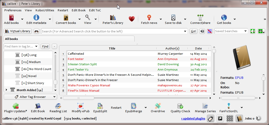 first of all thanks for your reply. What I am looking for is not to color a column but a line in Calibre. Example: I have 10 Tom Clancy books. Have read 8 of them, these lines I would like to mark red. The 2 lines with unread books stay black. When I add new books to Tom Clancy collection they appear in black lines so easy to find. I do not have a Kobo but a Sony PRS-T2 ereader so I do not know if I can change like you did. |