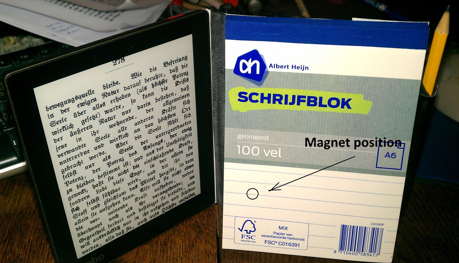 My workaround for the Aura is a sleepcover. Or in my case a A6 notepad duct-taped to the side with a small magnet at a position to trigger the sleep mode. Mine mirrors the bottom-right corner at 4 cm from the bottom, 2,5 cm from the side. (see pictures) Last edited by Markismus; 05-11-2014 at 06:56 AM. |