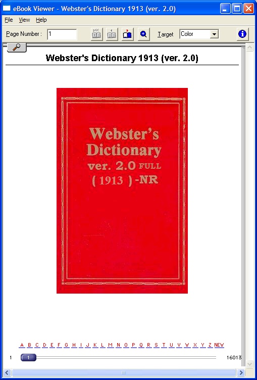 I automated the process to add TOC entries into a two-tiered TOC. I ended up adding just over 2600 TOC links. The idea was to space them evenly over every 50 words and then the mid point would be no more than 25 words from either side (word_before TOClink or word_after TOClink). With an average of (say) 5 words to a "page" that would mean the mid point would be only 5 page-turns away! Now, the exciting news (for the REB1200 version ONLY), all words referenced in a definition (i.e. Abase) like 'See Base' are now hyperlinked to that entry in the dictionary; some 50,000+ new links have been added by me! Unfortunately, the EBW1150, cannot handle this many links, so I've limited the EBW1150 version to only contain hyperlinks to words that are 7 letters or greater! This reduces sufficiently the number of links and can then be made to work with the EBW1150. I could not increase the number of hyperlinks by adding 6+ letters or less as it stopped working if I did. Again this only refers to EBW1150 version and the words referenced "inside" a definition; not the main words linked from the TOC! This conversion from .html to .imp takes siginificantly longer, about 3.5 hours! Even though this is a 100 year old dictionary, I hope you find it useful. I know some people will probably read it like a book.... ![]() BTW, did I mention IT'S HUGE. HOW TO INSTALL FOR EBW1150 users You need both parts 1 & 2 of the 'Websters Dictionary 1913.imp' zip below (the 1st & 2nd attachments below). The .html source for this ebook is included separately (the 3rd attachment below). FOR REB1200 usersNote the EBW1150 .imp ebook was produced with the 'View with Small Font Only' option so that it would work with the EBW1150's more limited memory. Also, when reading a definition and it refers to another word, the link exists only for referred words that are 7+ characters in length. This was a trade-off to allow this .imp ebook to work, as 6 character or less words just constantly rebooted the reader. Also, the first time you use a link within this .imp ebook, you may get a message that Your eBook has exhausted an internal resource... and the unit says Restarting.... Just try again as the EBW1150 just freed all available resources so as to allow the links to work now! You need both parts 1 & 2 of the 'Websters Dictionary 1913_1200.imp' zip below (the 4th & 5th attachments below). The .html source for this ebook is included separately (the 6th attachment below). Then using HJSplit or similar just combine the two parts after unzipping them i.e. .001 and .002. If you don't mind using the command prompt, type the copy command below:Aside: The REB1200 source .html can also be used with the attached wordlist (the 7th attachment below) hyperlinking all 110,875 words into the main dictionary .html. This can be used to create a new/different tier-two TOC instead of using just every 50th word! Code: