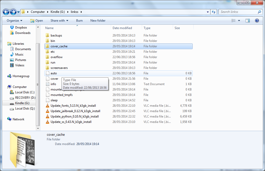 I'm using a Kindle 3 keyboard. My problem is that it seems to be in cover mode, and in KUAL it says it is, but its only using the cover of the first book I open, any other books I open after that seem to be ignored. When I open up the linkss/etc/last_read file in chrome, it's always set to the same book that I first opened up. I've tried uninstalling and reinstalling linkss, but it again just saved the first book and ignored any afterwards. I've tried waiting for 10 minutes at a time after opening subsequent books, but with no luck. Here's a shot of my links folder (attached). Any idea why this is happening? Also, gotta say thanks for making the hack, it's really brilliant