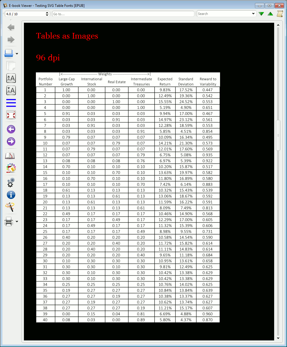 is better than this: (Notice the SVG text is specified as black... Black on black, no good!). and here is a screenshot of the 96dpi image of the table: This is an example of the disadvantage of going the image route... while it looks fine on white background + black text, it begins to fall apart when the user decides to use anything else as their background colors. And sure, sure, the HTML table I made isn't as pretty... but it follows user preferences. The HTML table can change font size/color, and scale to quite a large font size on the same size screen (comparable to the image/SVG). Also, your book will become much more accessible to a person with poor eyesight (this is one of the FANTASTIC advantages of ebooks compared to their (crappy) physical counterparts!). Quote:
