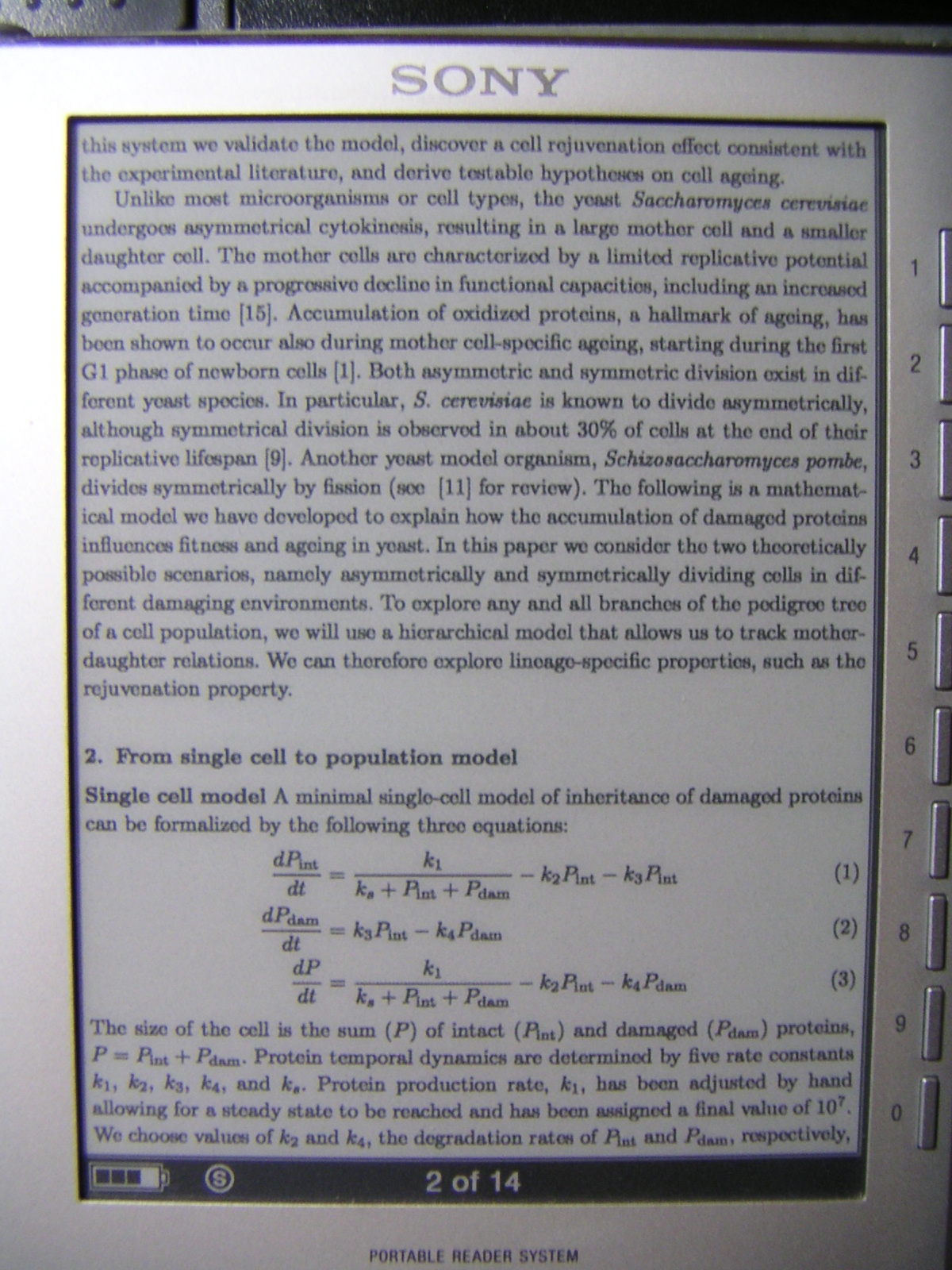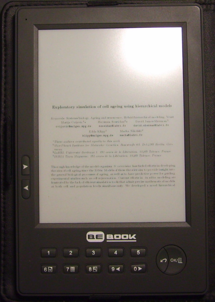 I've read most of the reviews for most of the devices available in France (PRS505, Cybook, Bebook) at a reasonable price. I'm on the edge of buying a Bebook, for its long battery life and more importantly, its PDF Support! Could somebody confirm this by posting some pictures of the bebook displaying this pdf : http://www.labri.fr/perso/soueidan/p...ell_ageing.pdf I'd interested by pictures of any page at the zoom level making it confortable to read for you... If you could give me your age too, I'd a happy and grateful fellow ![]() Thanks a lot ! |