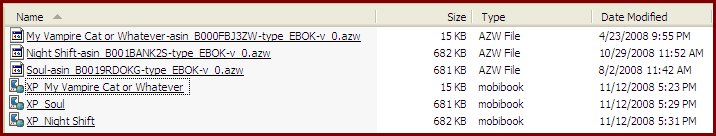 Also, even those this books were downloaded from Amazon as DRM'd .azw files, they were renamed with the .mobi extension. All books opened just fine.