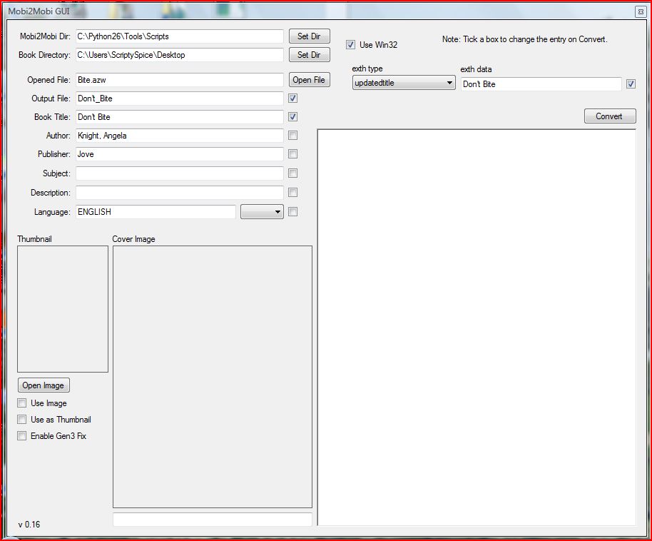 *That* was the ticket Wallcraft. The GUI now with the "exth data", works perfectly!